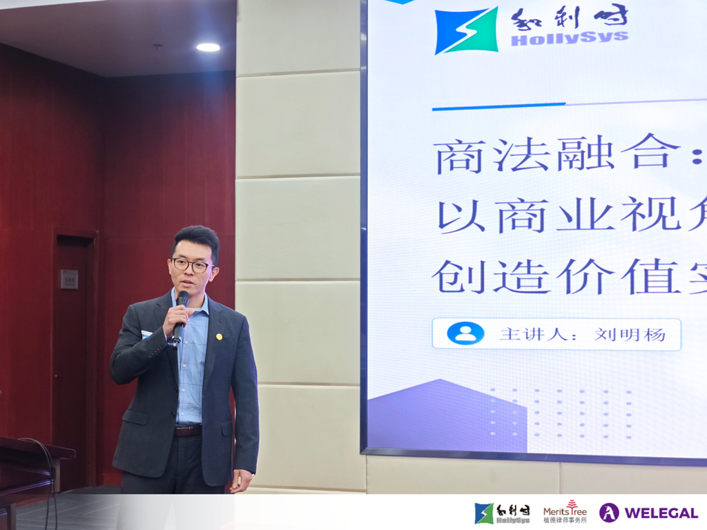 和利时法务及知识产权负责人刘明杨代表和利时对大家的到来表示欢迎,简要介绍了和利时的发展历程、使命愿景,并在讲述职业经历的过程中强调了法商融合对公司法律人职业跃升的重要性。随后,刘总围绕“商法融合: 以商业视角、法律思维创造价值实践案例”这一主题展开分享。他通过一系列的实务案例,讲解了在企业对外投资的过程中,公司法律人如何理解公司战略、融入法商思维、掌握多维视角、制定解决方案,从而实现从被动响应者到战略开拓者的角色转换与商业贡献力的跃升。